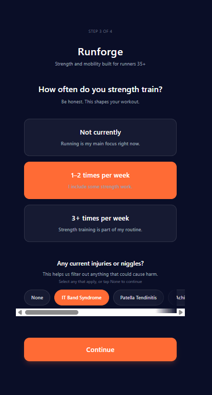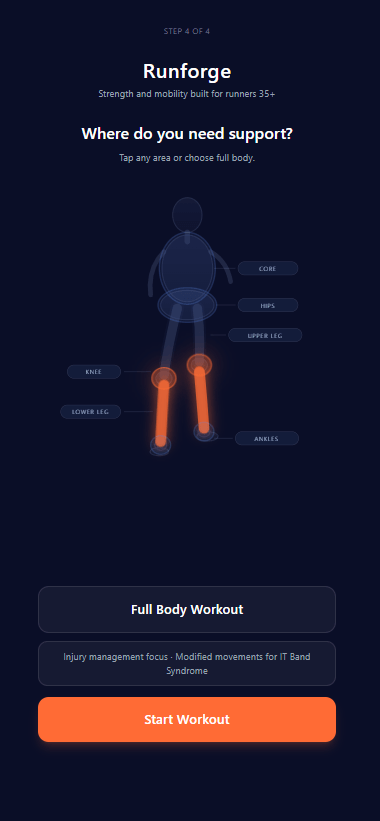 Runforge gives you strength + mobility routines you can do in 30 minutes or less. No equipment, just your body, so every run feels confident, not risky. Built for runners who want to keep running!